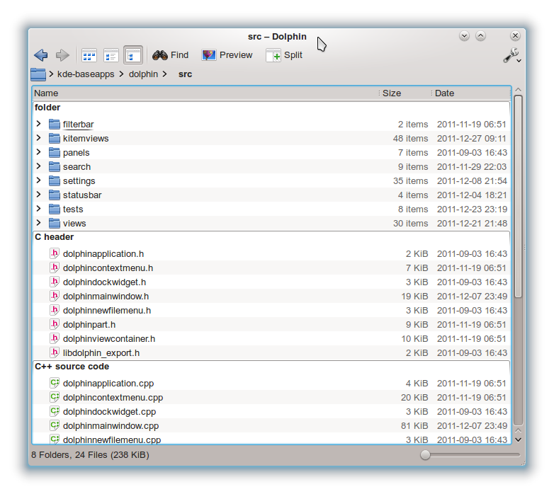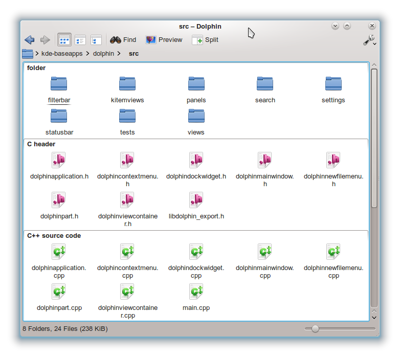 When introducing Dolphin 2.0 I talked about grouping support for all view modes. But I could not offer any screenshots, as this feature was not ready yet at that time. So here we go showing the same folder grouped by the file type in the icons-mode (which is already available since Dolphin 1.2):